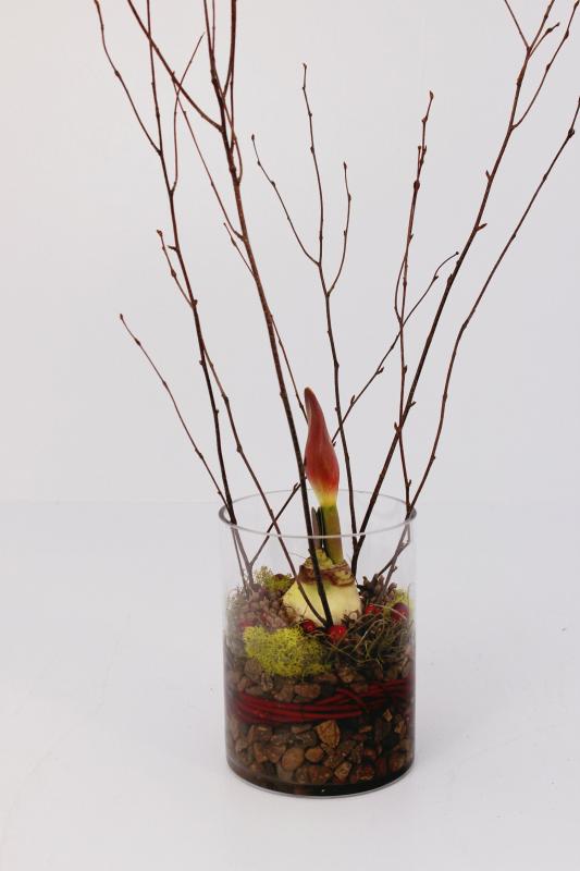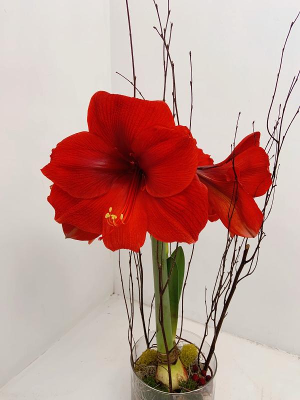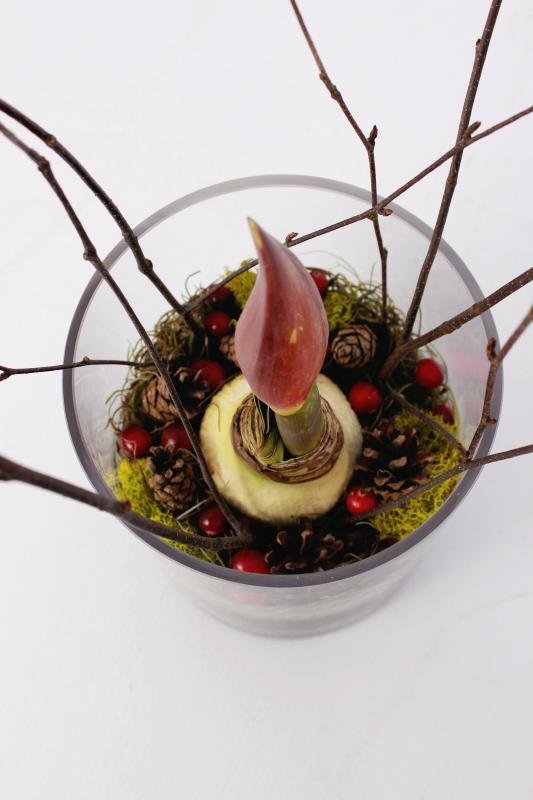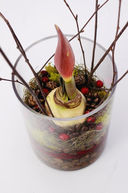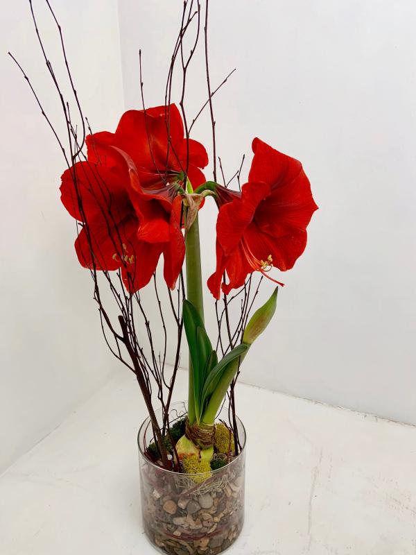 A beautiful wintry arrangement, featuring an amaryllis accented with moss and other natural elements. Watch the amaryllis grow and bloom over the holiday season!