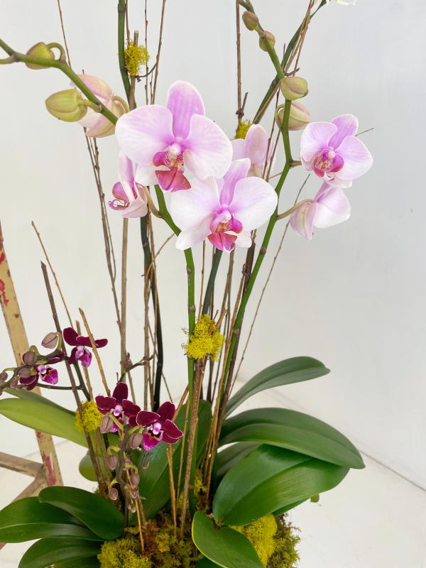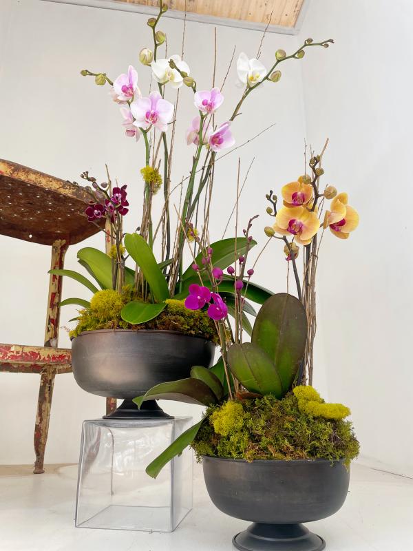 A beautiful arrangement of orchids, varying in size and color in a black compote.