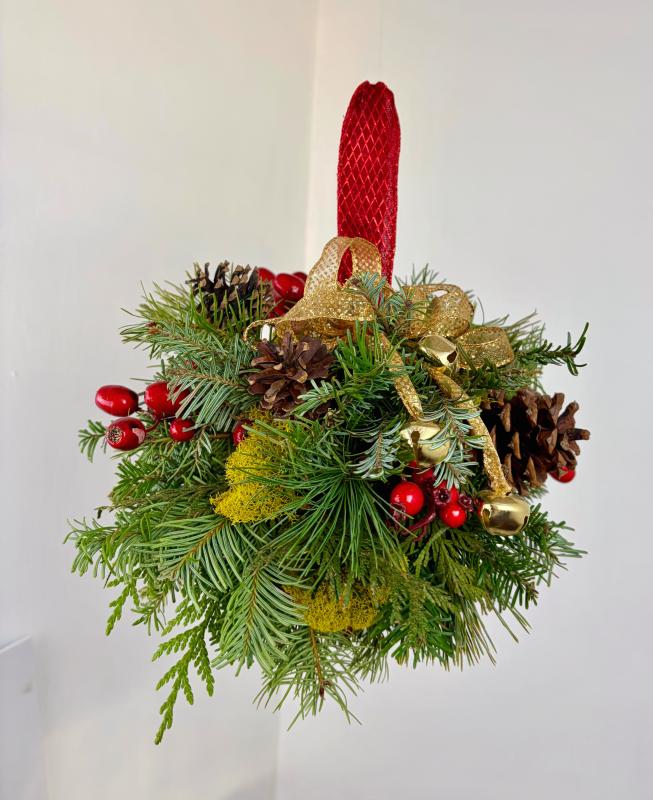 Participants will create their own mistletoe from start to finish using a variety of materials including evergreens, berries, pine cones, ribbon, bells. Begin the process with a 4" oasis and chicken wire sphere (prepared by instructors), fill with greens, and select ribbon for hanging.