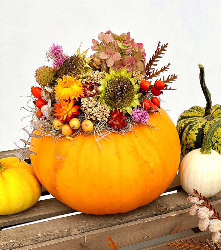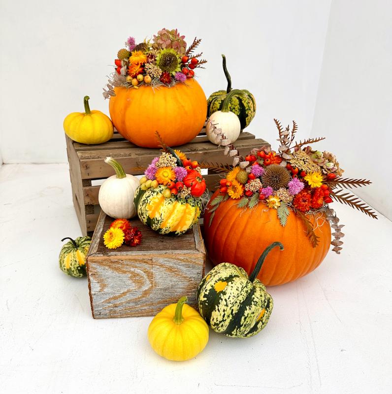 A fun and unique edition to your fall decor! Choose between a small, medium, or large pumpkin to adorn your home. Uncut fresh pumpkin with preserved fall foliage.