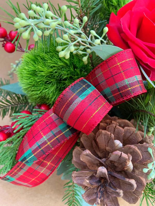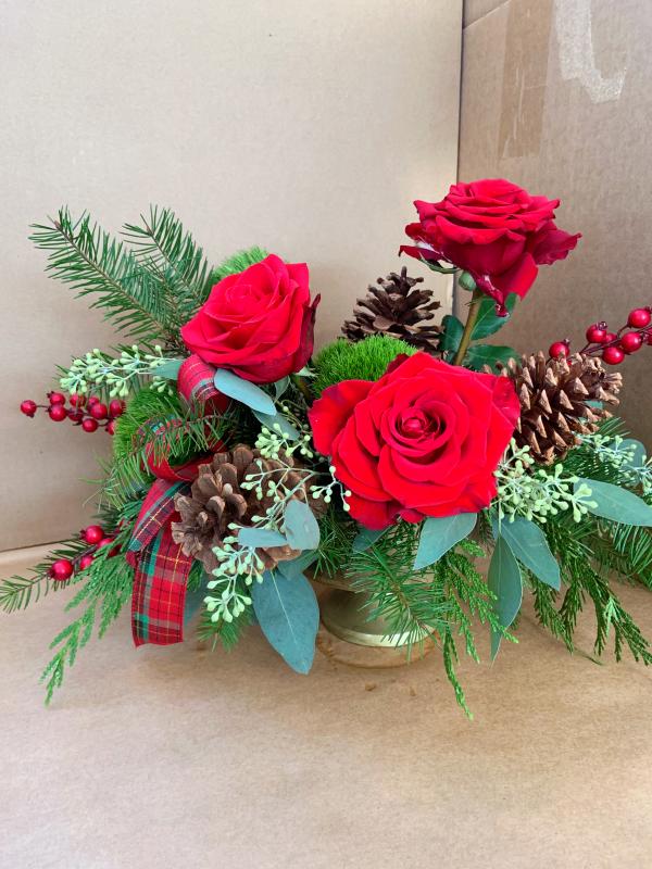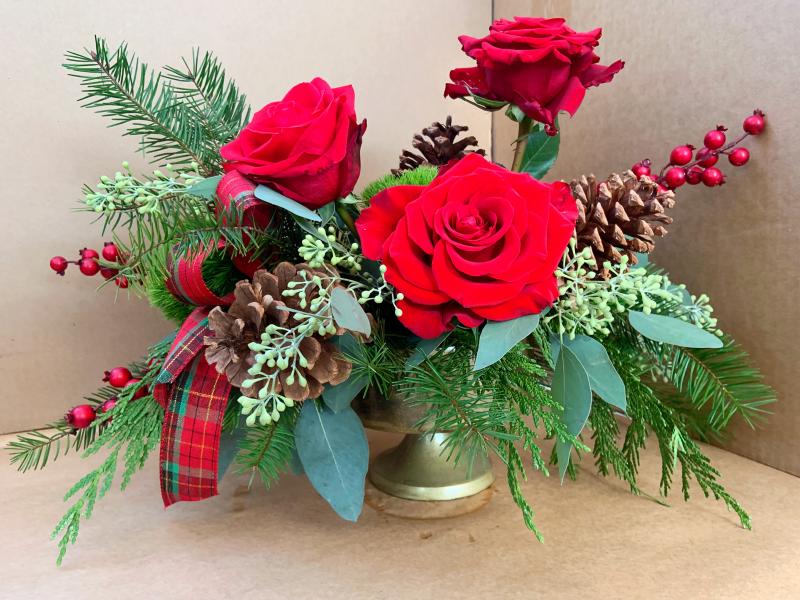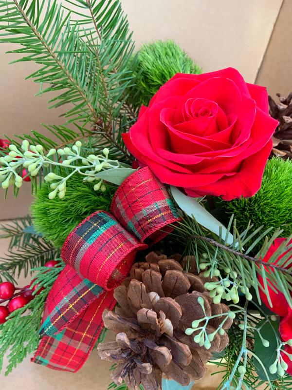 Send some holiday cheer via this beautiful arrangement featuring red roses and wintry greens. Arranged in a vase.