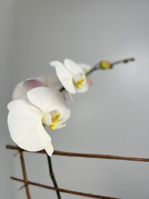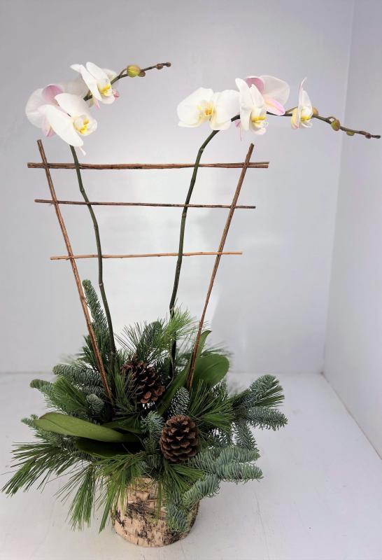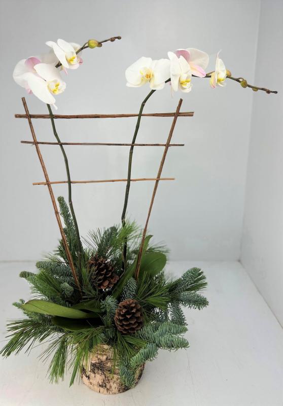 Two orchid stems nestled into moss, adorned with pine cones and fresh cut greens inside a 6” birch container.