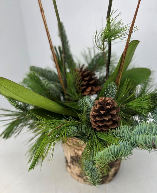 Two orchid stems nestled into moss, adorned with pine cones and fresh cut greens inside a 6” birch container.