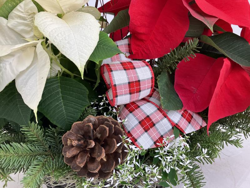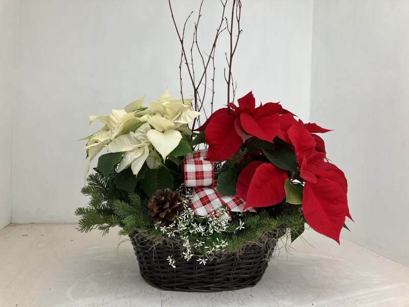 A beautiful arrangement, featuring Edwards grown poinsettias and the best of the season’s foliage, arranged in a basket.