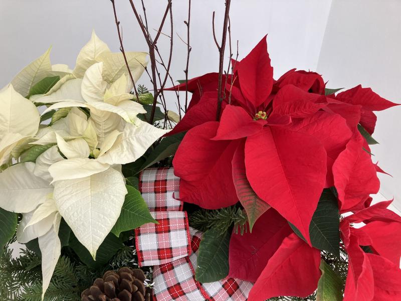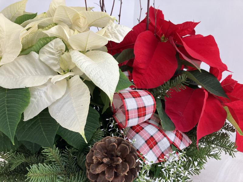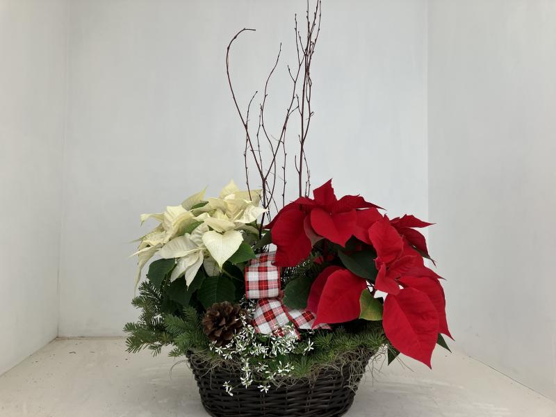 A beautiful arrangement, featuring Edwards grown poinsettias and the best of the season’s foliage, arranged in a basket.