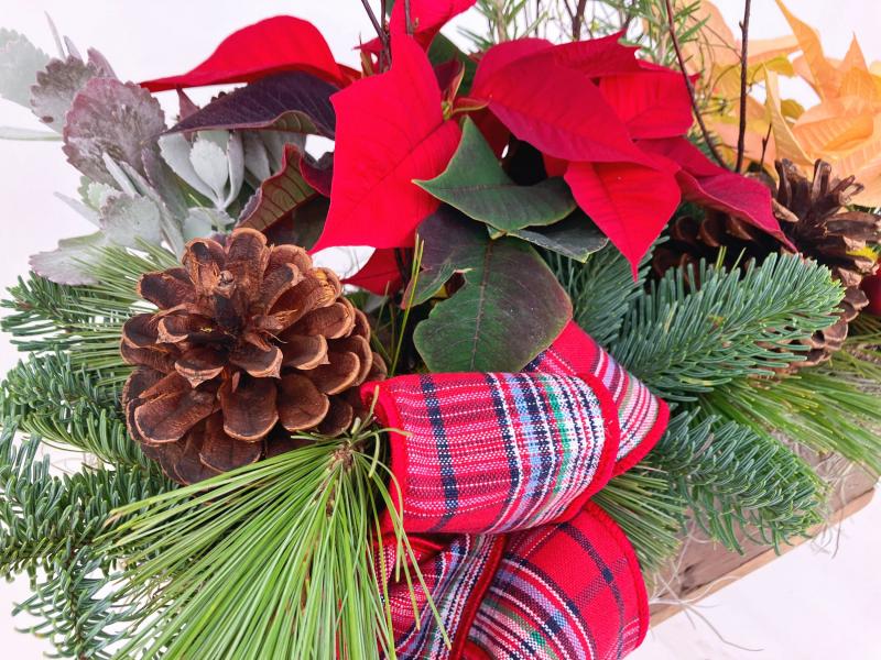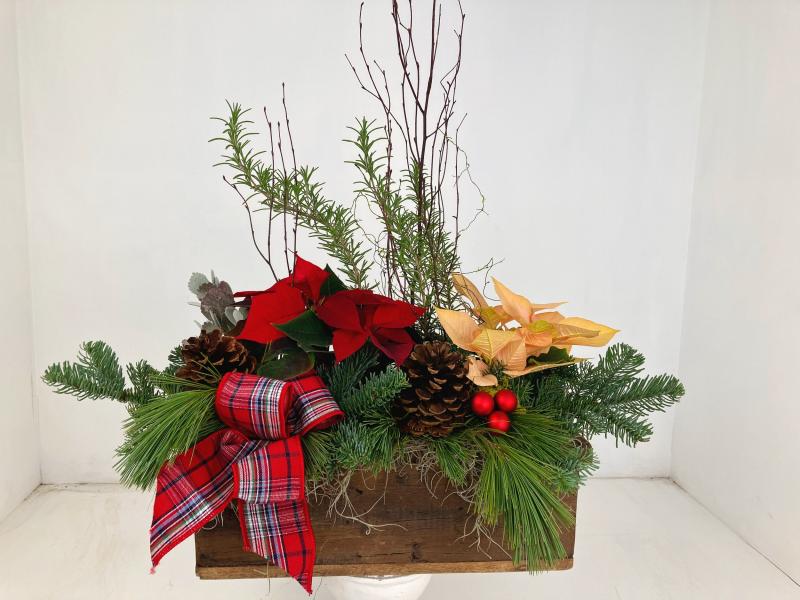 A beautiful arrangement, featuring Edwards Greenhouse grown poinsettias, and seasonal foliage, arranged in a wooden crate.