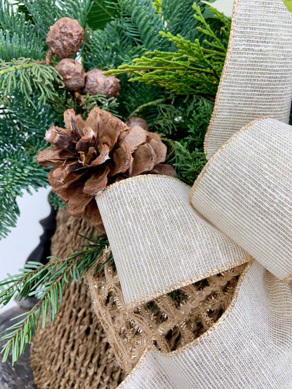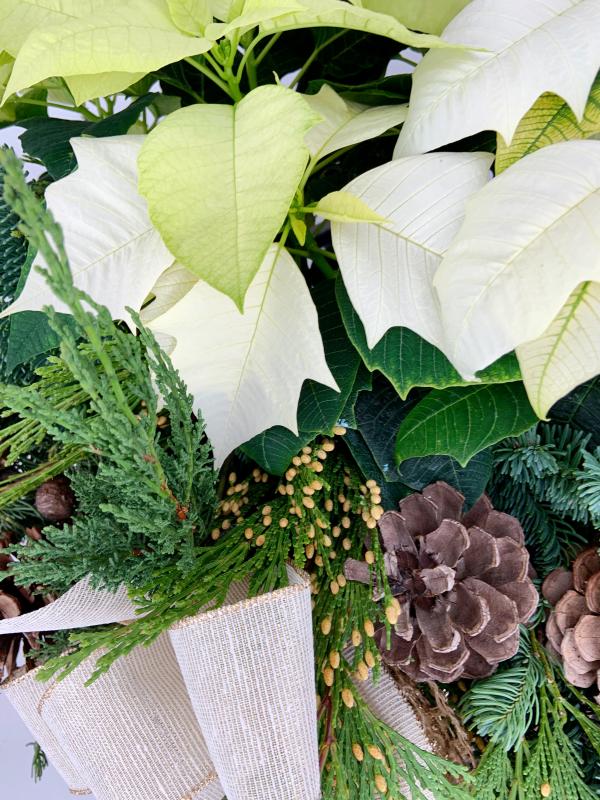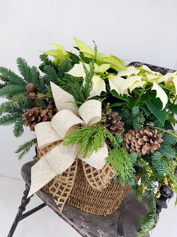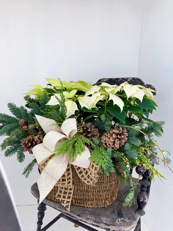 Evergreens, white poinsettias, cones, etc. in a basket.