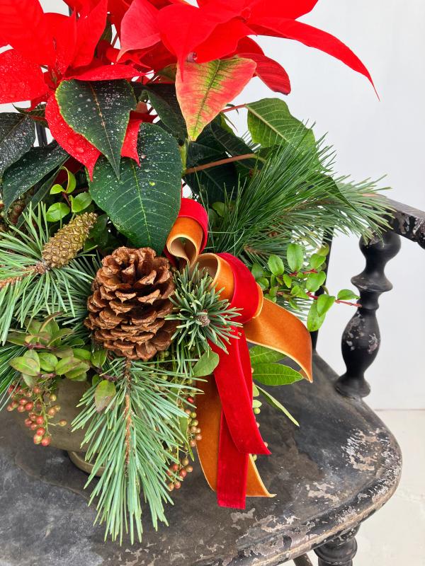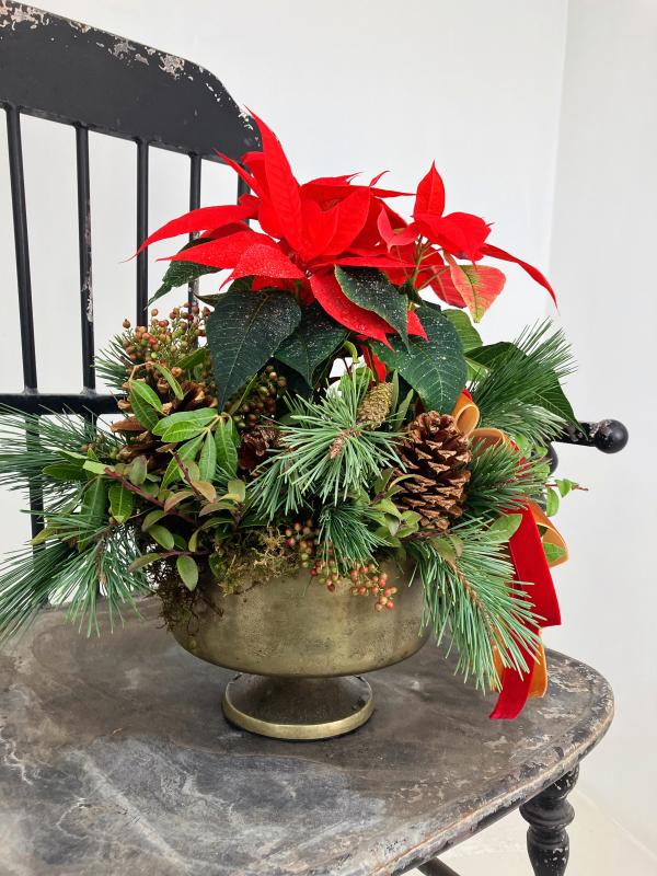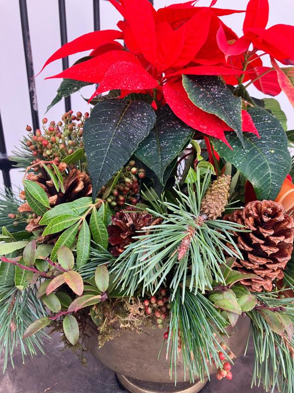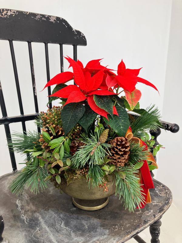 Send some holiday cheer via this beautiful arrangement. Featuring Edwards grown poinsettias, winter greenery and foliage, arranged in a pot.