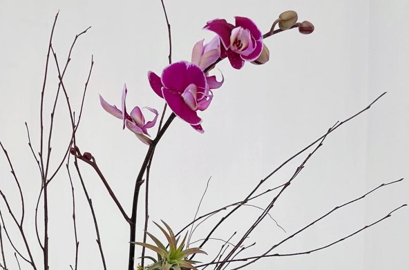 A beautiful orchid and airplant arrangement with white ceramic pot.