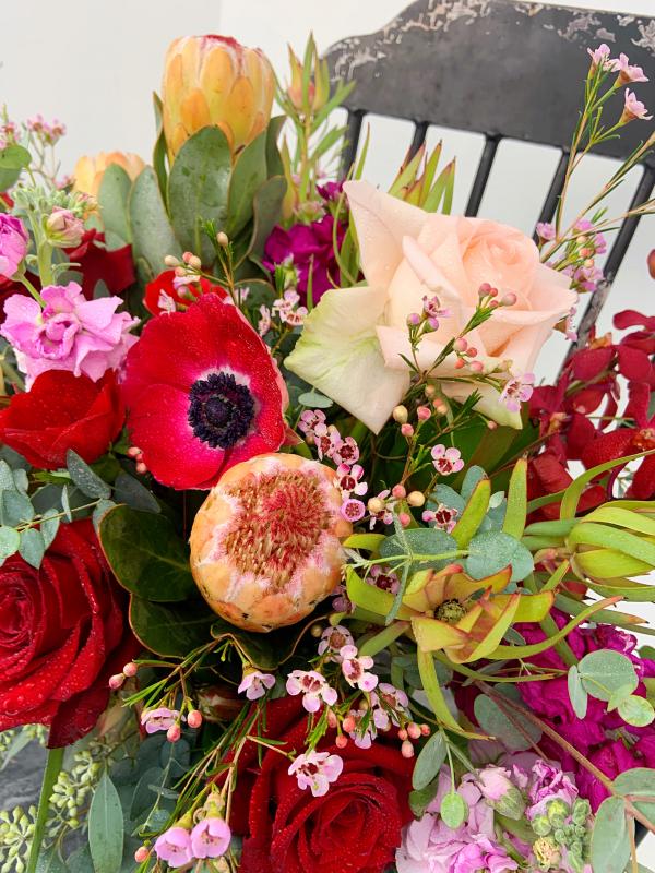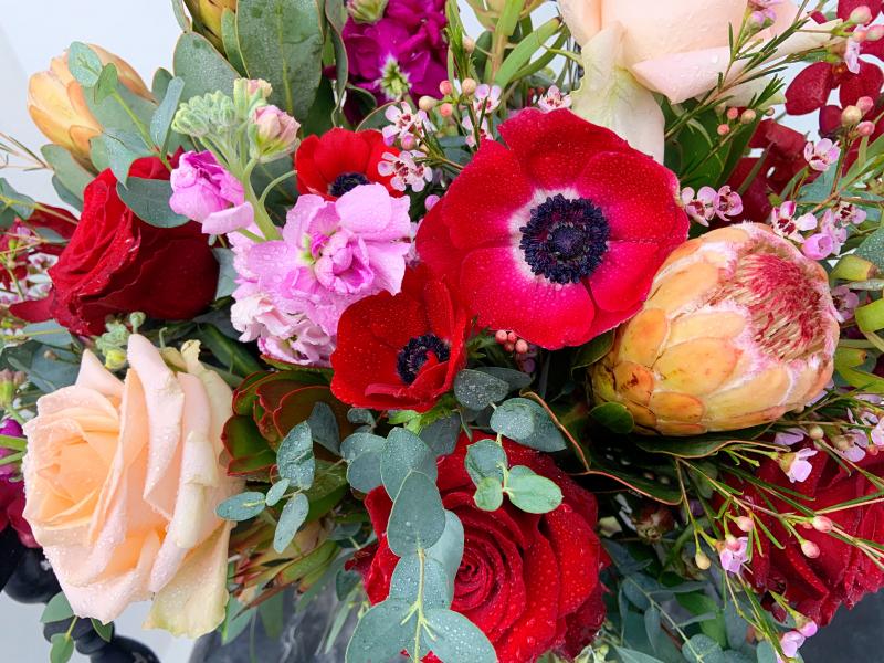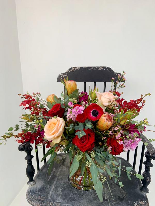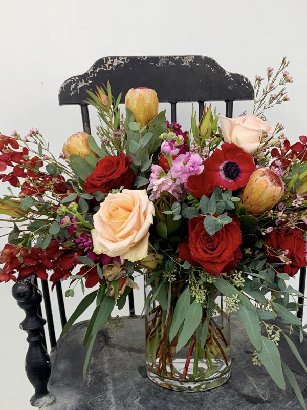 Seasonal blooms in clear vase.