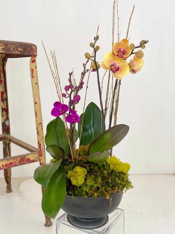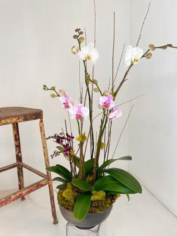 A beautiful arrangement of orchids, varying in size and color in a black compote.