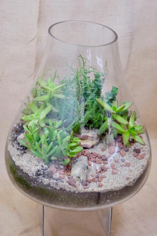 An extra large succulent terrarium with rocks and sand in a teardrop vessel. Easy care, spray with water every 2 weeks! Artfully designed, this long-lasting planter will impress on any shelf or table. Featured succulents will vary based on available inventory.
