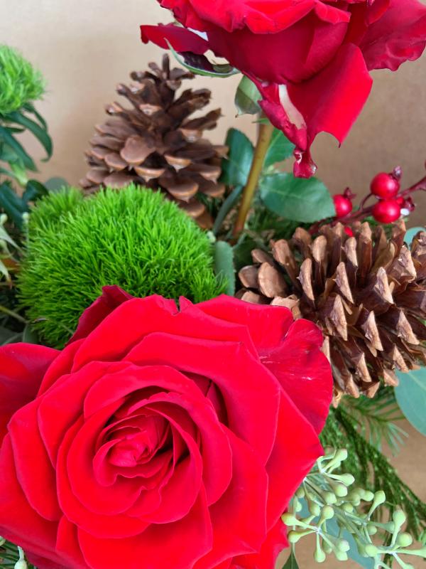 Send some holiday cheer via this beautiful arrangement featuring red roses and wintry greens. Arranged in a vase.