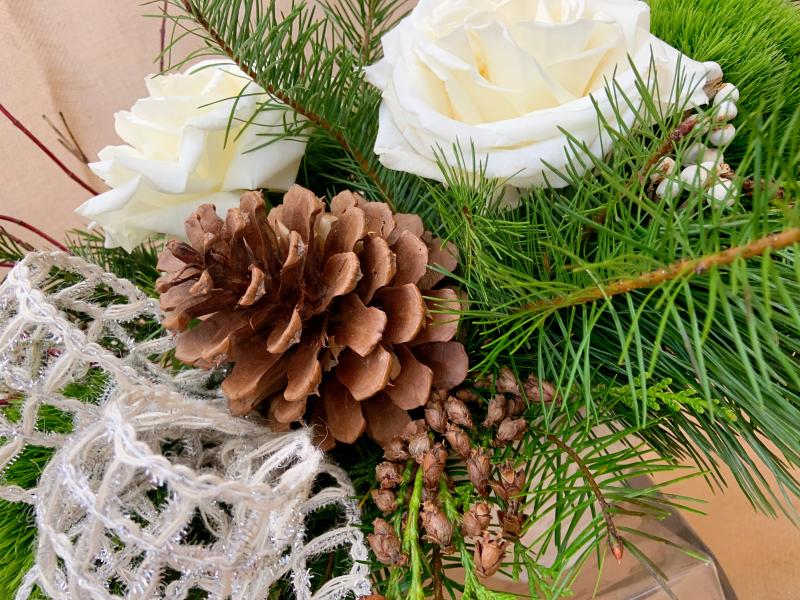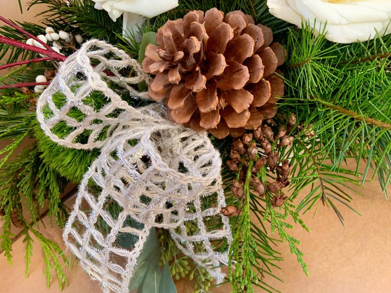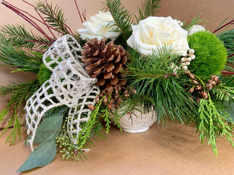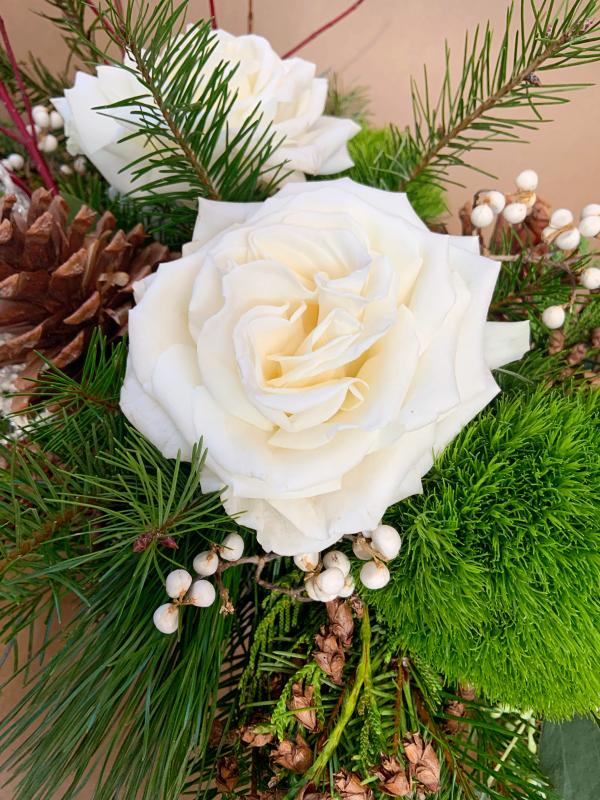 Dreaming of a white Christmas. A classic white winter arrangement featuring fresh wintry florals, winter greens, and seasonal foliage arranged in a vase.