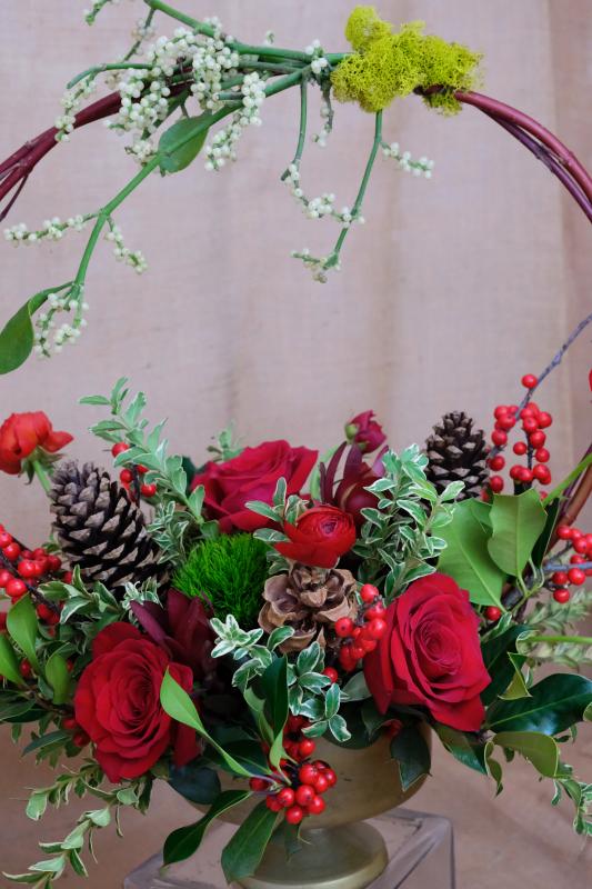 A unique holiday arrangement featuring red roses and wintry greens under an arch of mistletoe. Arranged in a vase.