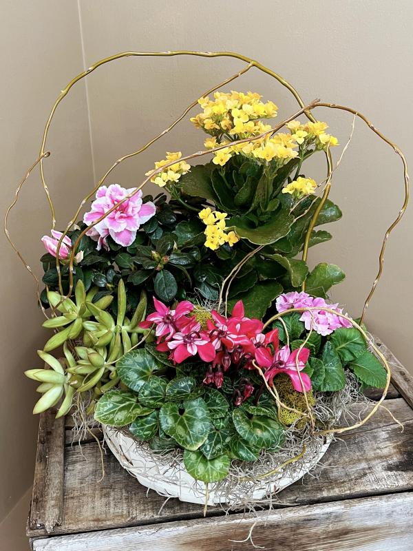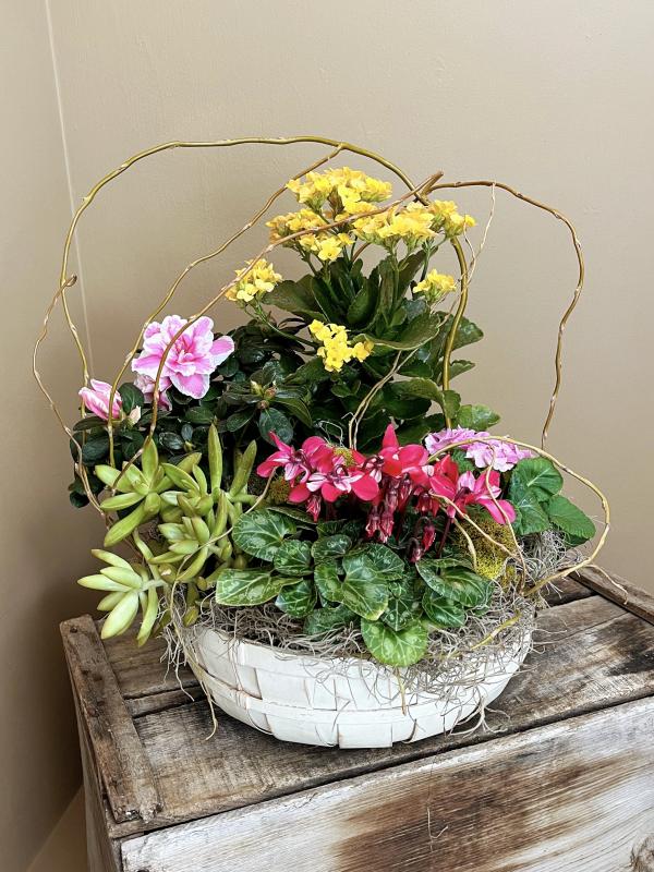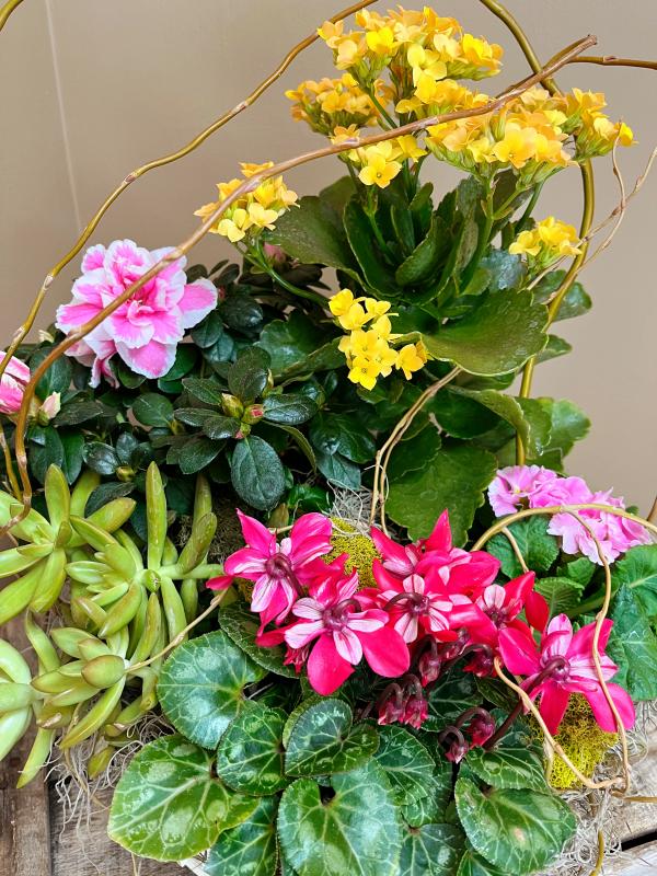 A garden basket featuring a lovely assortment of blooming plants that the one you love is sure to have a Bloomin' Good Time with!