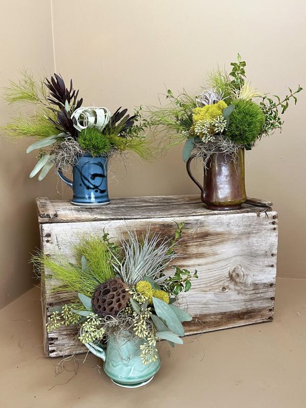 Send a hug in a mug: a thoughtful arrangement of greens, airplant, and accents in a one-of-a-kind mug made by local Katabatic Pottery! A unique gift that lasts!