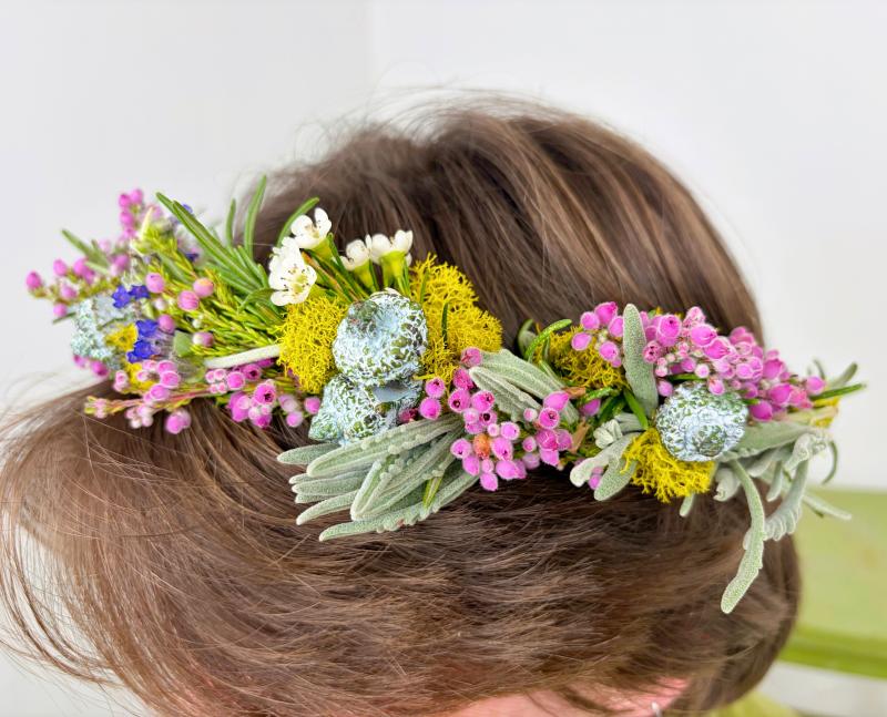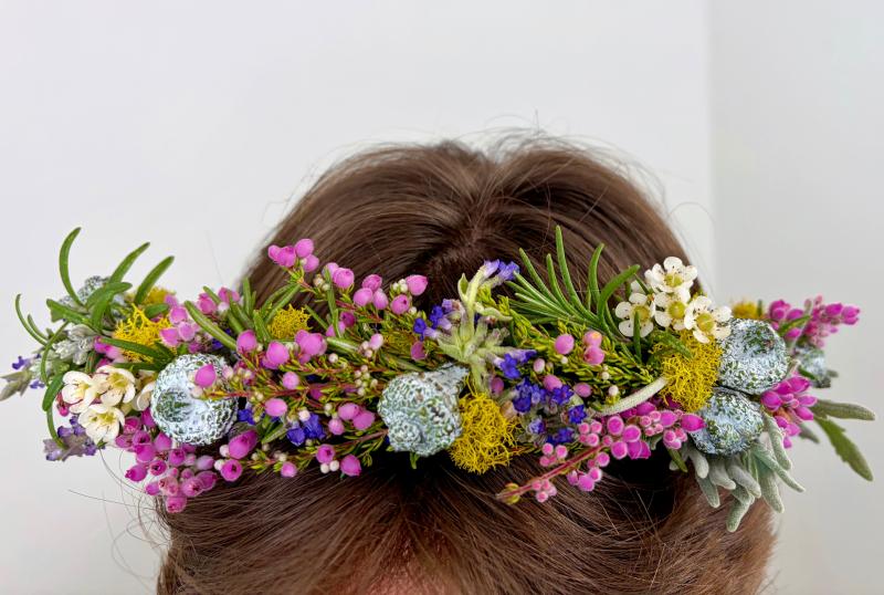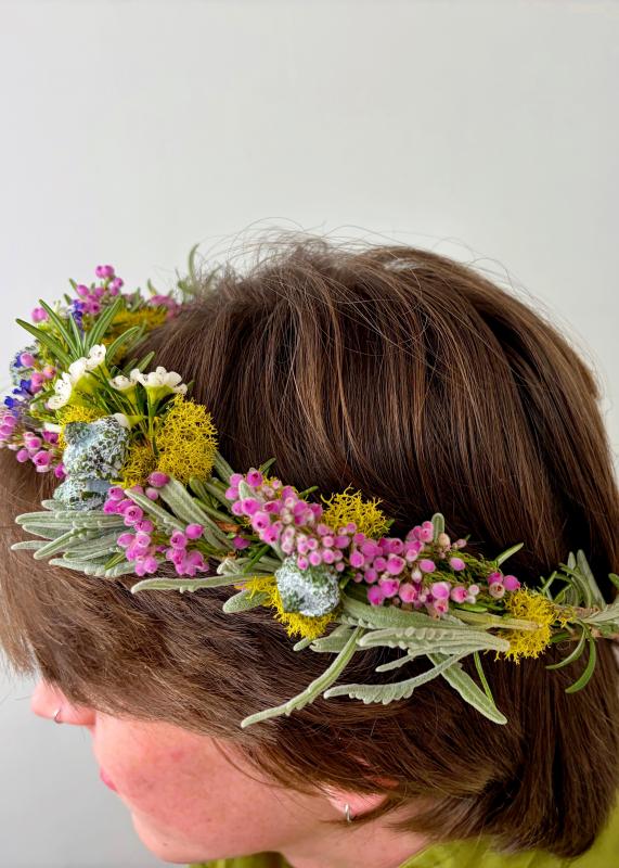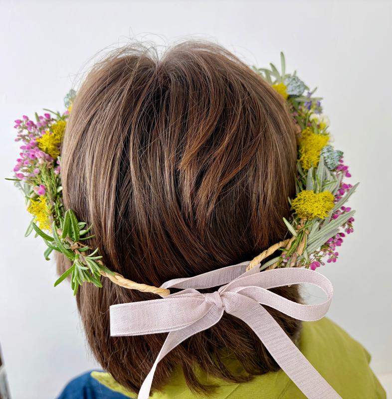 Create your own beautiful flower crown, using fresh flowers and ribbon, to wear and cherish.