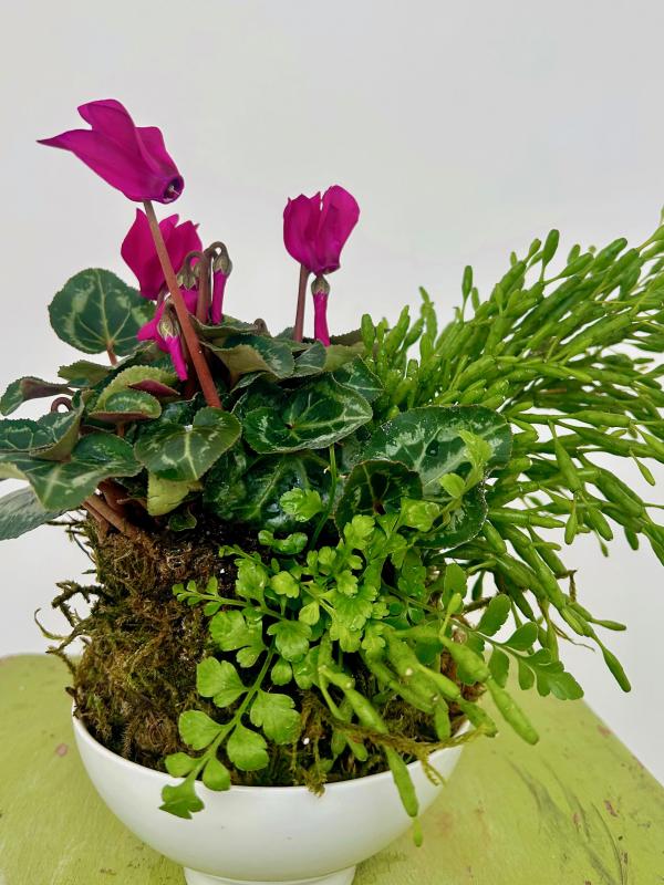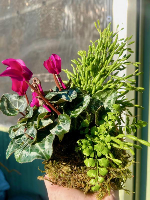 Craft a hanging plant feature using cyclamen, ferns, bark and moss.