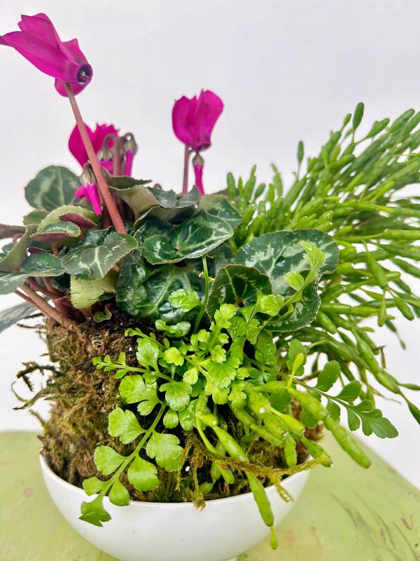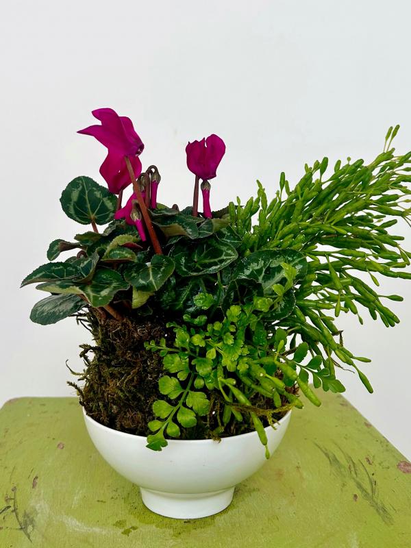 Very cool Japanese style of plant bundling featuring a blooming cyclamen, a succulent and a fern presented in a simple compote.