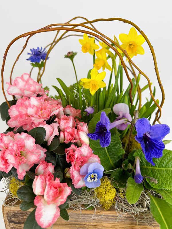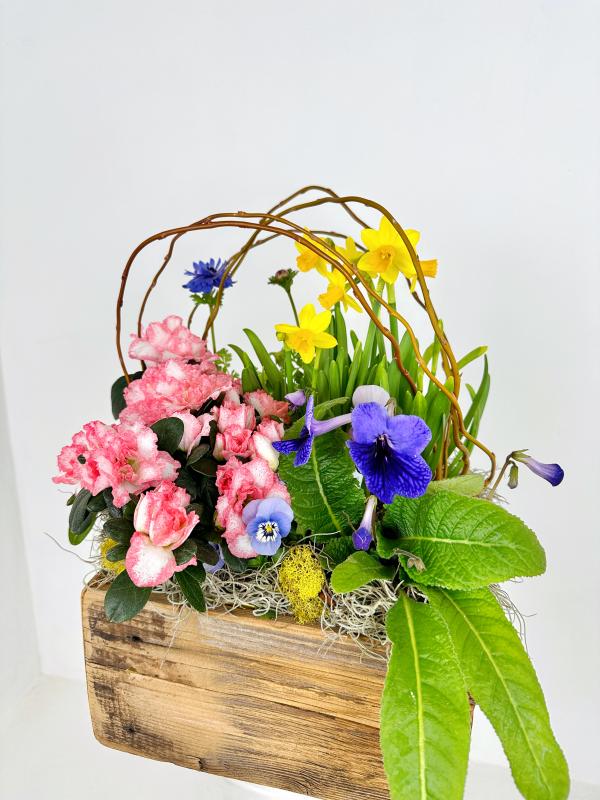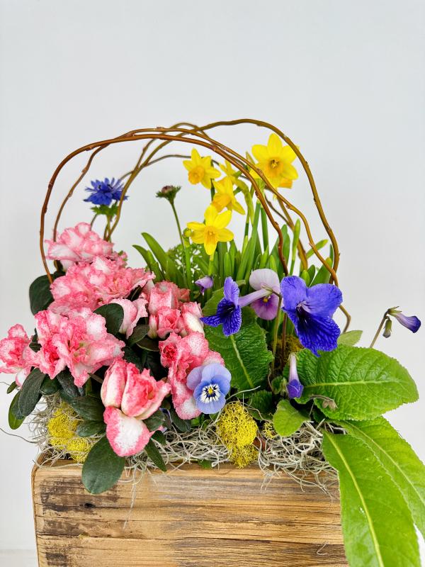 A selection of our best spring flowers arranged in a wooden crate.